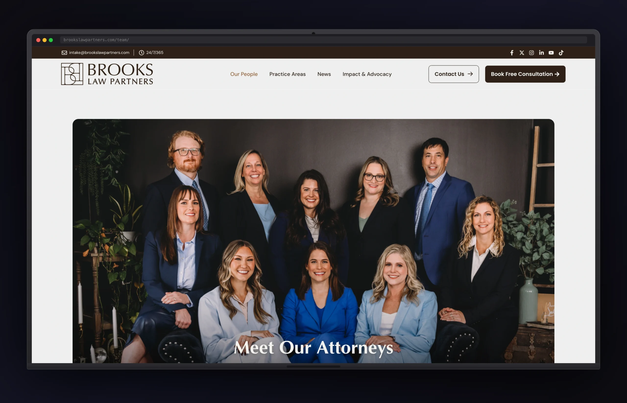 Brooks Injury Law is a personal injury law firm that needed a website capable of establishing credibility instantly and converting visitors into consultation requests. Law firm websites live and die by trust signals — the design, content structure, and copy all need to communicate authority and empathy simultaneously.