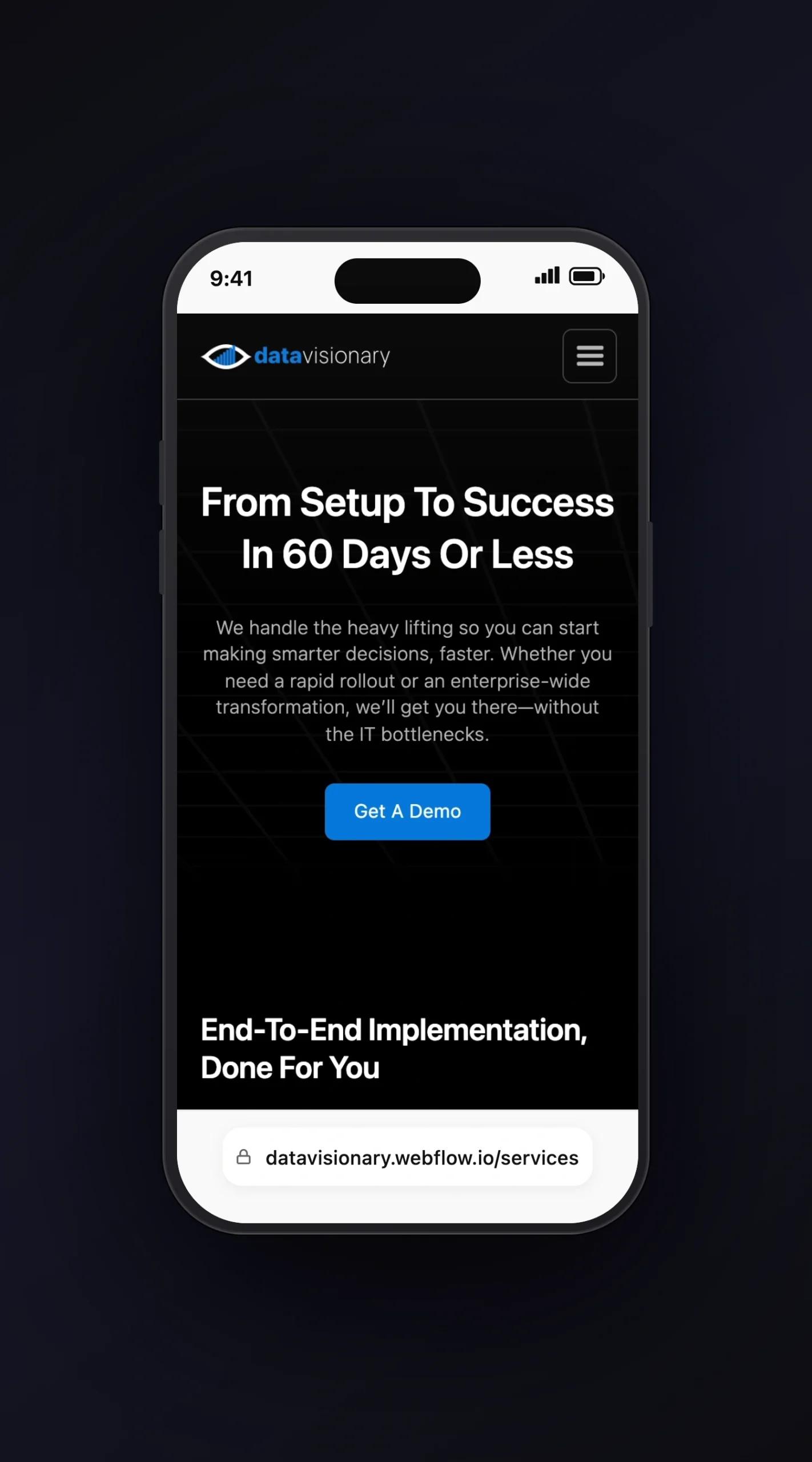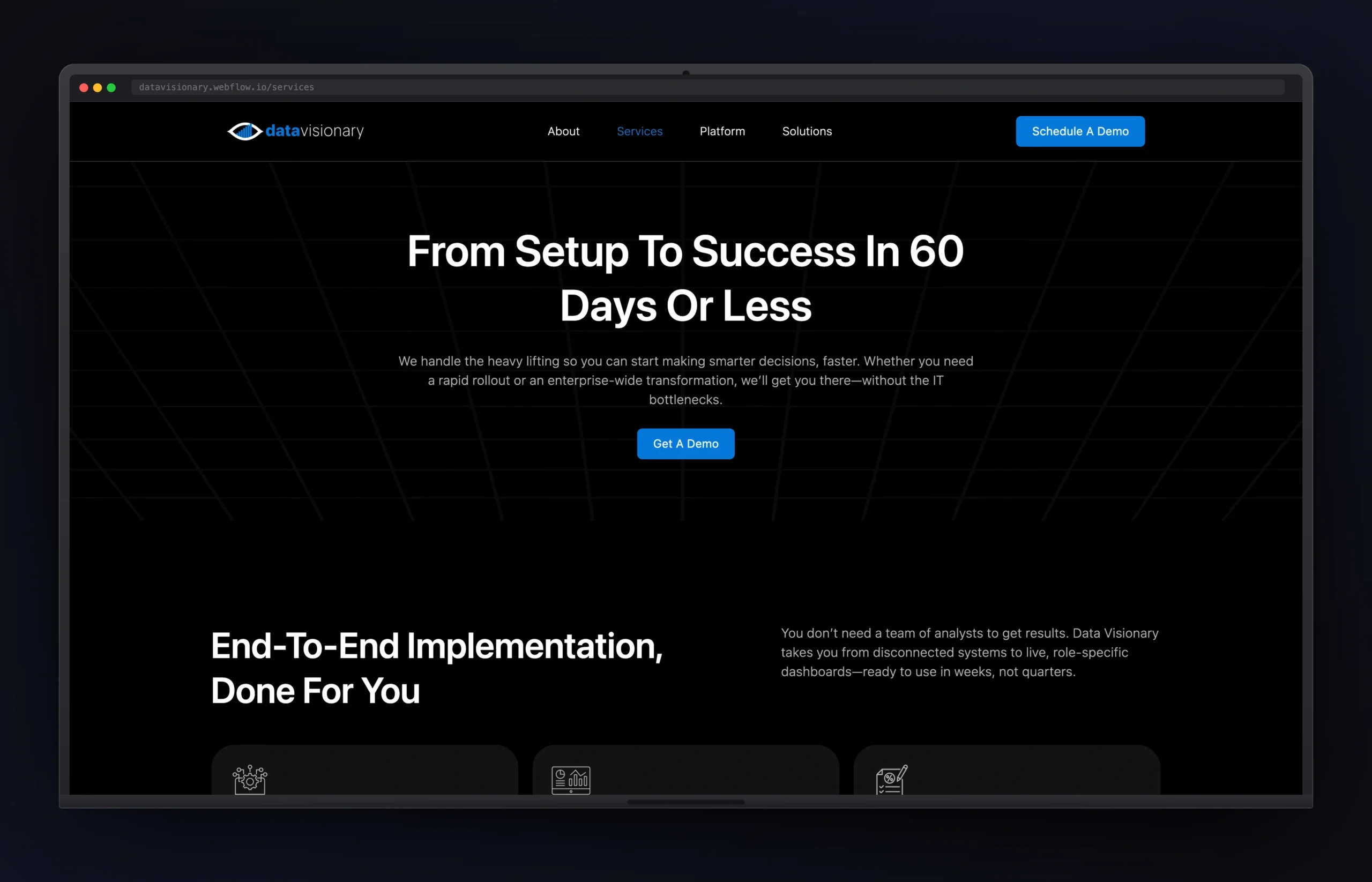 Data Visionary is a data analytics and business intelligence consultancy that helps organizations make sense of their data through dashboards, reporting infrastructure, and strategic analytics consulting. They needed a modern Webflow site that matched the sophistication of their work and attracted enterprise-level clients.