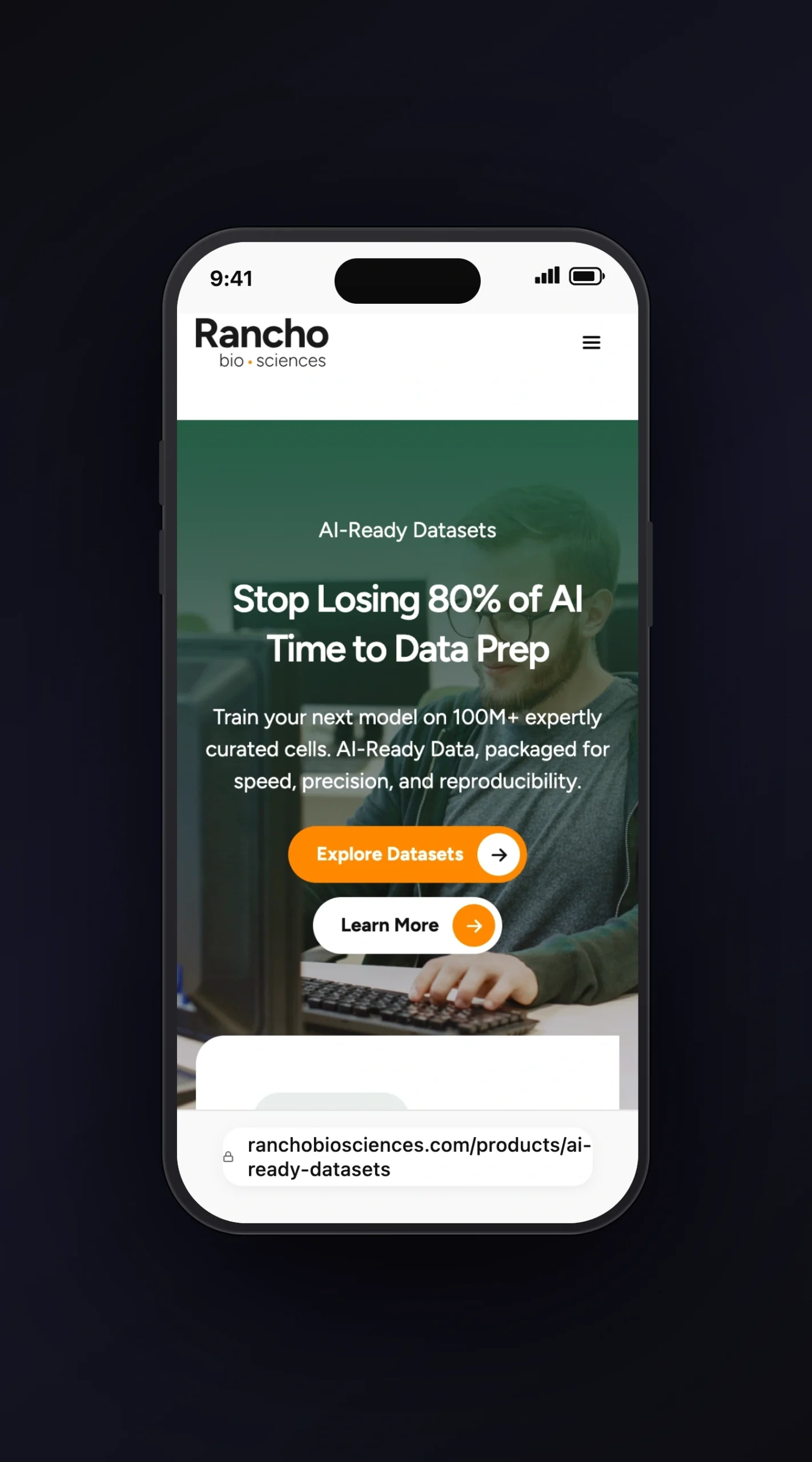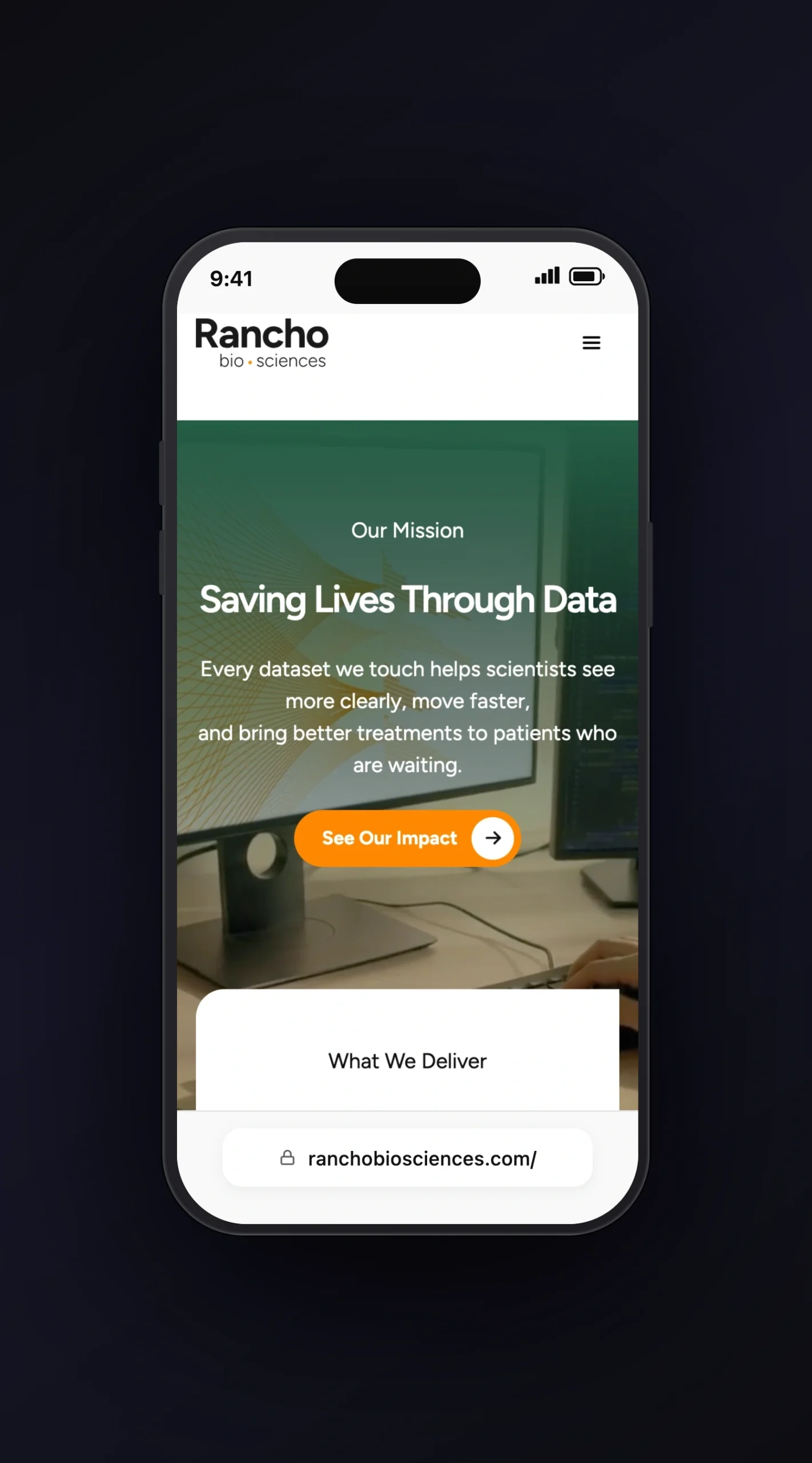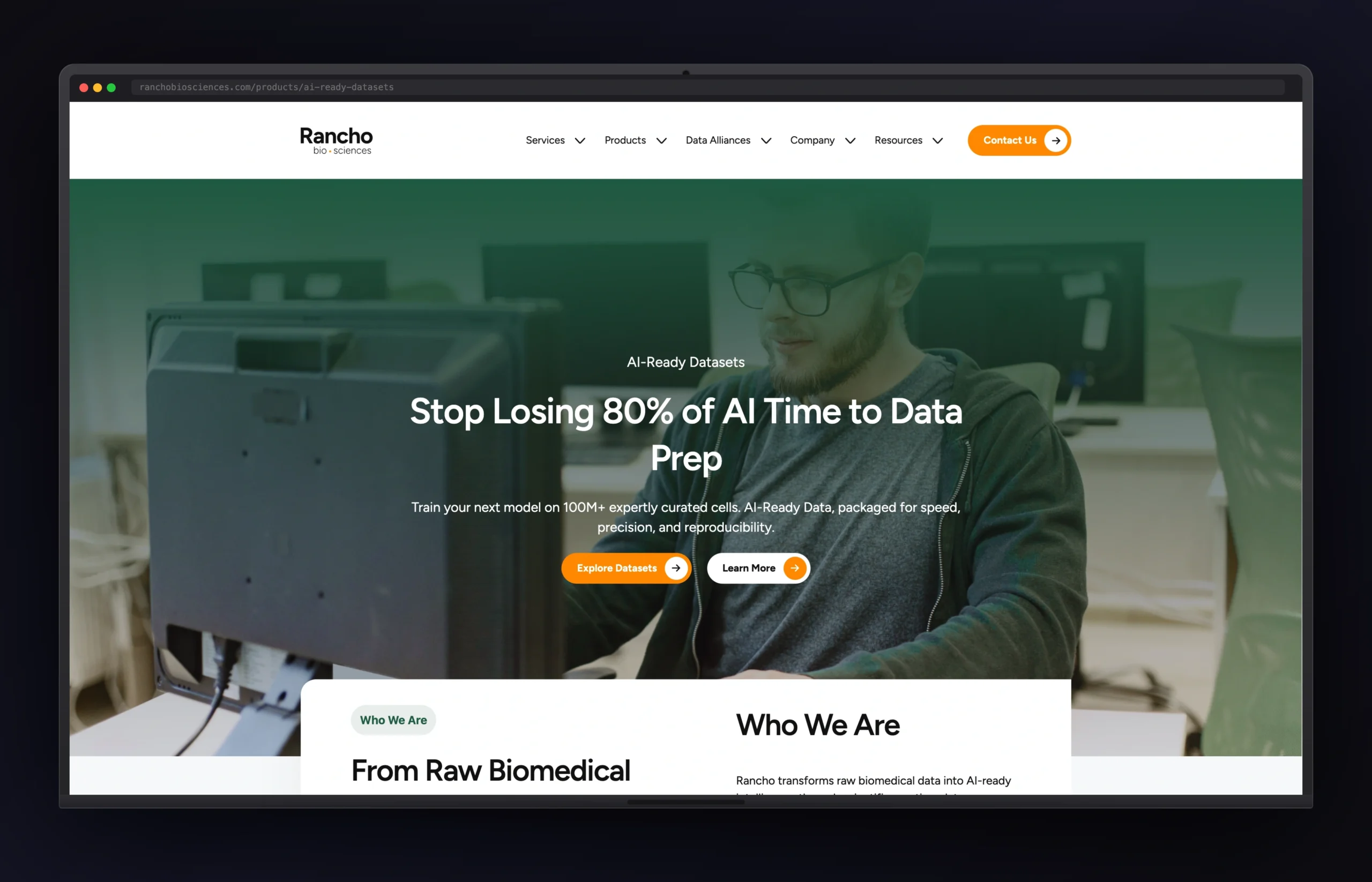 Rancho Bio Sciences is a contract research organization (CRO) specializing in preclinical study design, biospecimen procurement, and AI-ready research datasets for pharmaceutical and biotechnology clients. Their audience is highly technical — researchers, study directors, and procurement leads at major pharma companies — so the website needed to communicate scientific rigor without sacrificing approachability.