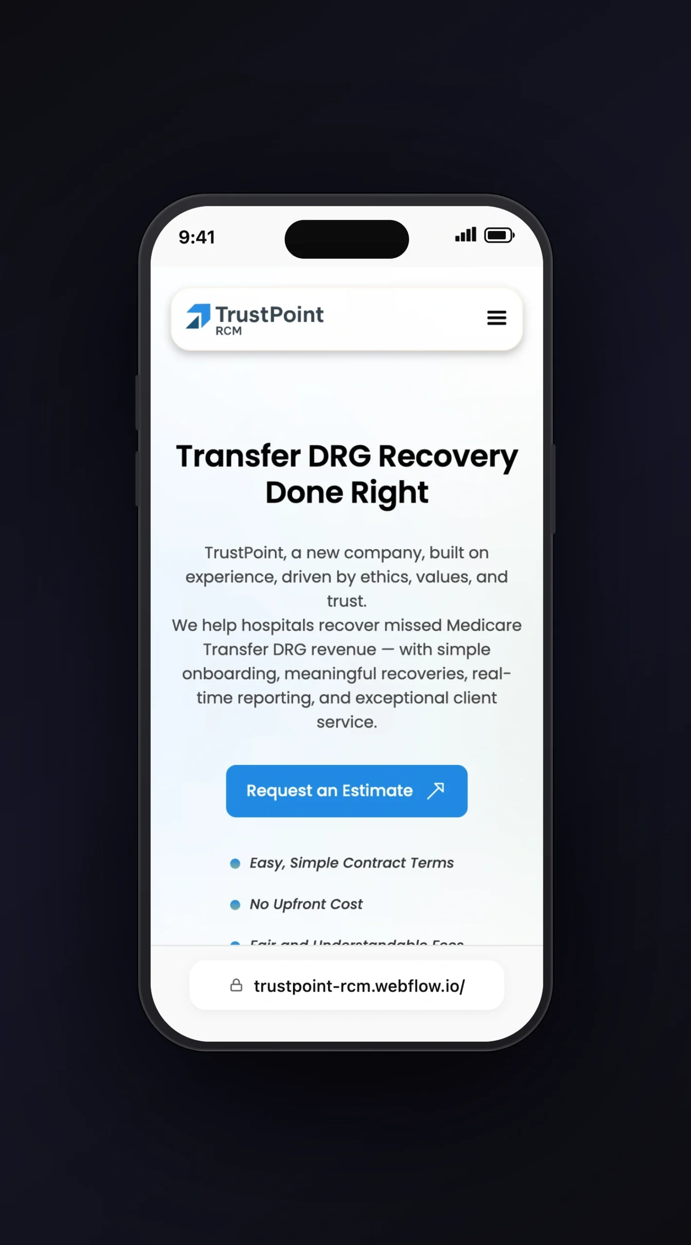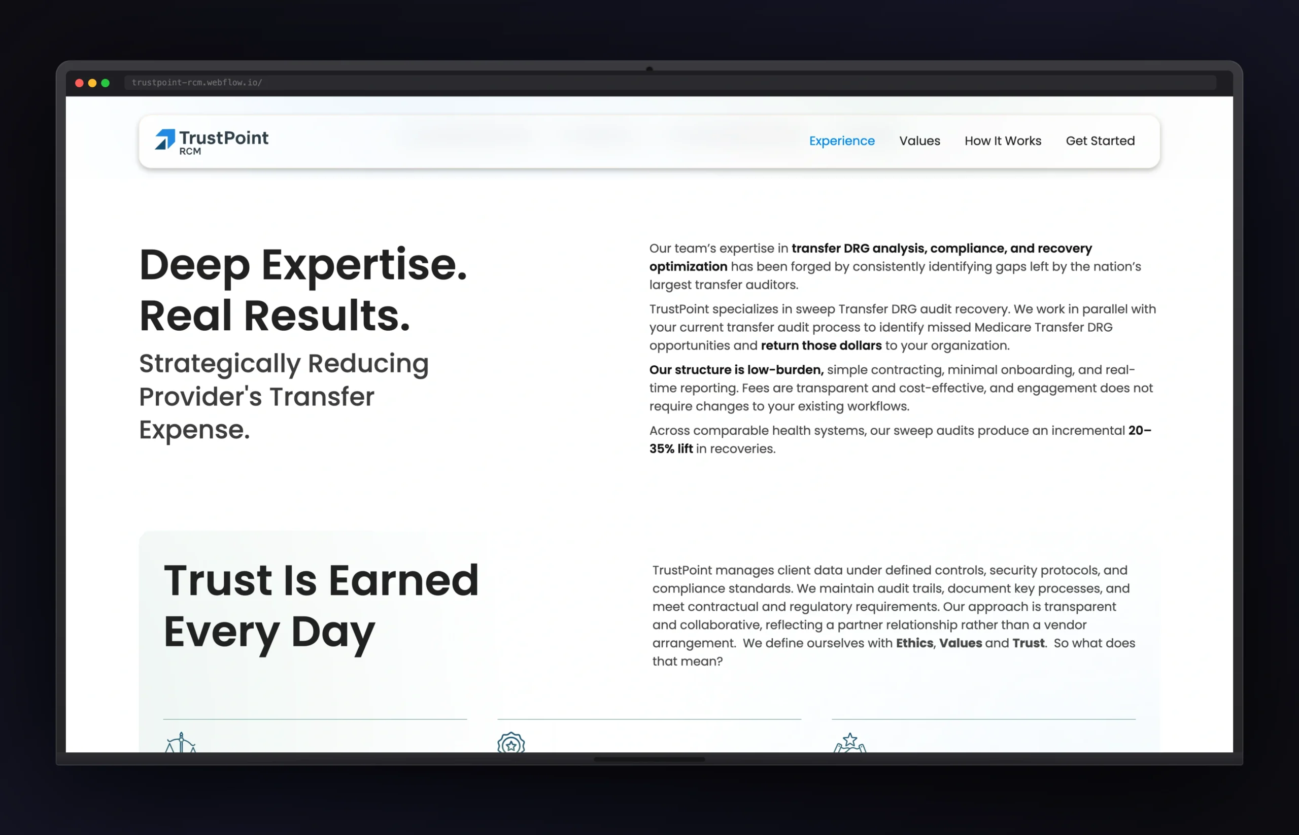 I built the site in Webflow with a design that communicates reliability and precision — appropriate for a company handling the financial infrastructure of medical practices. The homepage leads with a pain-point framing: most practices are losing 15-20% of revenue to billing errors and denials. This immediately connects with the target audience and positions TrustPoint as the solution.